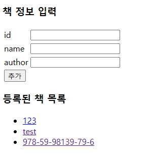 HTML 파일 책 정보 입력 id name author 추가 등록된 책 목록 id name author Model(책 정보) 정의 package com.example.hellospring.controller; import lombok.AllArgsConstructor; import lombok.Getter; import lombok.Setter; @Getter @Setter @AllArgsConstructor public class BookDTO { private String id; private String name; private String author; } BookController import com.example.hell..