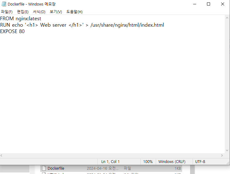 오늘의 학습!!! 어제 배운 docker 두번째 시간!!!! 오늘은 dockerfile을 만들어 레시피처럼 작성 후 도커이미지 만들기!!!! c : users 쪽에 dockerfile을 만들어 이렇게 적어주었구욥!!! wsl 입력 후 docker build 를 통해 새로운 이미지를 형성하고 이름은 nginx_with_dockerfile 별칭은 01로 하게 되면! 이렇게 이미지가 생성 빠밤 😊 대박 신기... 똑똑하네요 ㅋㅋㅋㅋ 파일찾아서 잘 해주는군 확실히 이게 어제 이미지에서 컨테이너 생성하고 수정하고 다시 이미지만드는 방식보단 훨씬 간단하군 ^^ 이렇게 만들어진 이미지를 통해 런을 하여 컨테이너를 만들면 요렇게 잘 런 되네요 ㅎㅎㅎ 그럼 이렇게 연결된 9090포트로 들어가보면! 이렇게 web serv..