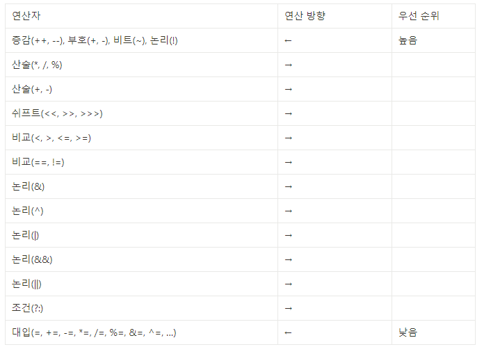 | 1. 단항, 이항, 삼항 연산자 순으로 우선순위를 가진다. 2. 산술, 비교, 논리, 대입 연산자 순으로 우선순위를 가진다. 3. 단항과 대입 연산자를 제외한 모든 연산의 방향은 왼쪽에서 오른쪽(->)이다. 4. 복잡한 연산식에는 괄호()를 사용해서 우선순위를 정해준다. |
