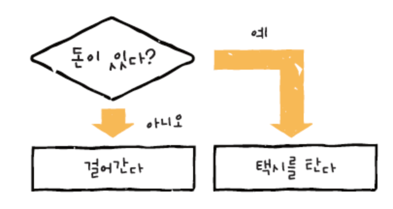 만약 돈이 있다면? true 일때 택시를 타고 false 일때 걸어간다!