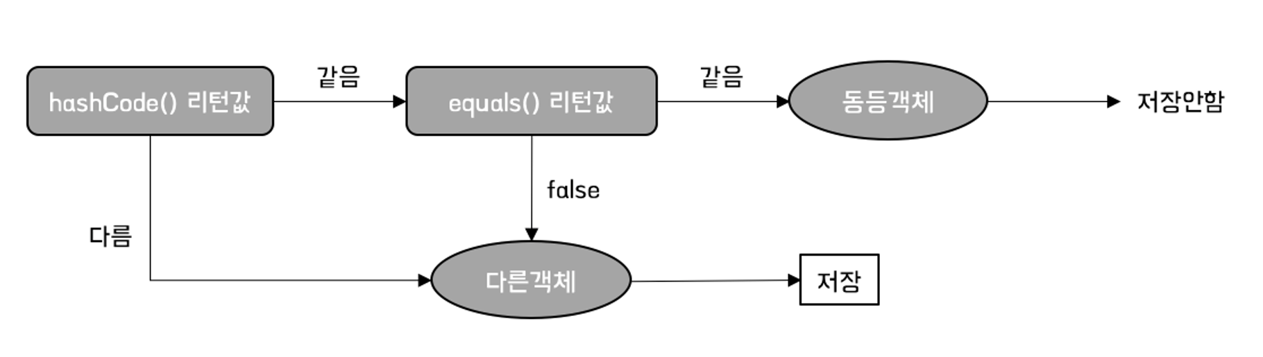 true일 시, 다시한번 equals로 객체를 비교하여 true가 나오면 동일한 객체로 판단하고 저장하지 않는다.