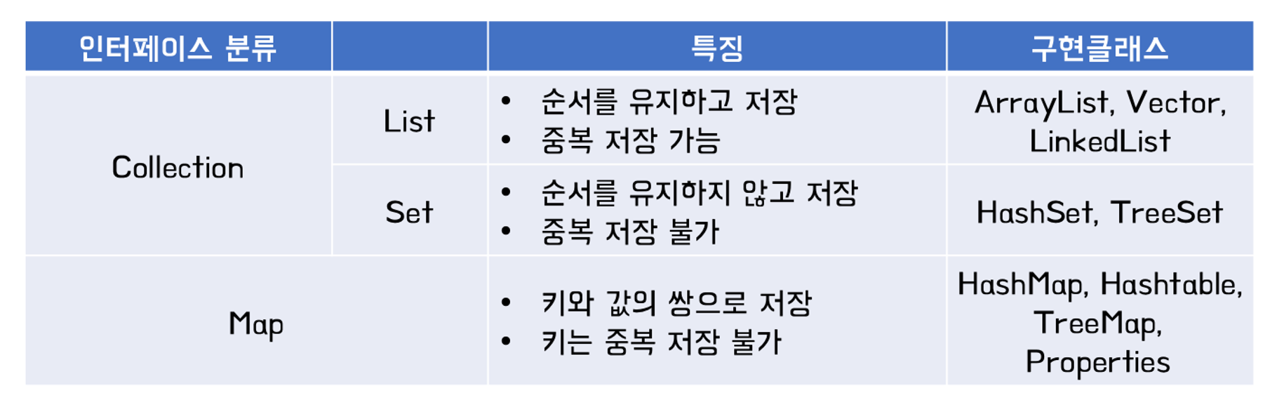 또한, 객체를 중복해서 저장할 수 없다는 특징을 지닌다.