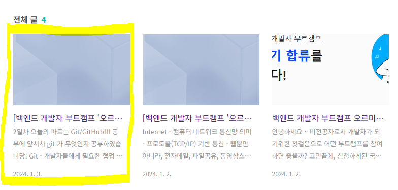 | [백엔드 개발자 부트캠프 '오르미4기'] 2일차 Git/Git Hub (2) | 2024.01.03 |