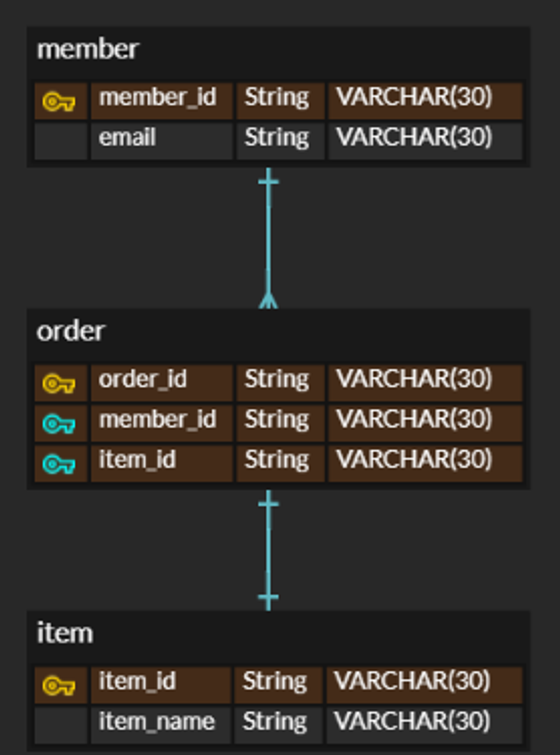 또한, member_id 필드가 member와 order에 양쪽 모두 존재하는 것을 보아
