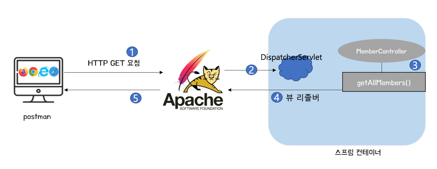 3. /members GET 요청을 처리할 수 있는 getAllMembers() 메소드와 요청이 매치그리고, getAllMembers() 메소드에서 비즈니스 게층과 퍼시스턴스 계층을 통해 필요데이터 가져온다.