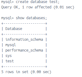 빠밤 여기서 create database test; 를 입력하여 테스트를 추가하면?