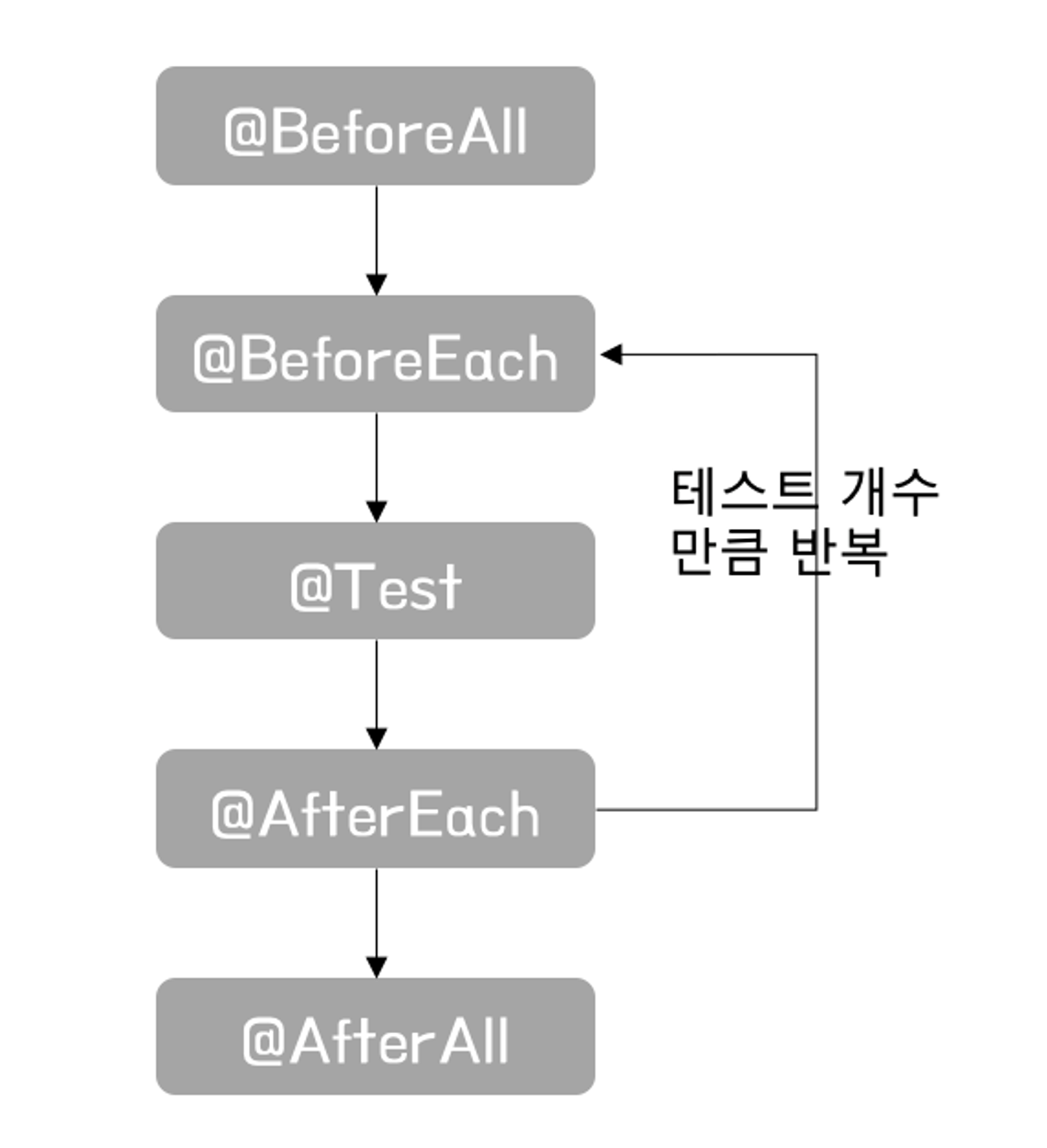 | @BeforeAll 어노테이션 전체 테스트를 시작하기 전에 처음으로 한 번만 실행합니다. 예를 들어 데이터베이스를 연결해야 하거나 테스트 환경을 초기화할 때 사용합니다. 이 어노테이션은 전체 테스트 실행 주기에서 한 번만 호출되어야 하기 때문에 메소드를 static으로 선언해야 합니다. @BeforeEach 어노테이션 테스트 케이스를 시작하기 전에 매번 실행합니다. 예를 들어 테스트 메소드에서 사용하는 객체를 초기화하거나 테스트에 필요한 값을 미리 넣을 때 사용할 수 있습니다. 각 인스턴스에 대해 메소드를 호출해야하므로 메소드는 static이 아니어야 합니다. @AfterAll 어노테이션 전체 테스트를 마치고 종료하기 전에 한 번만 실행합니다. 예를 들어 데이터베이스 연결을 종료할 때나 공통적으로 사용하는 자원을 해제할 때 사용할 수 있습니다. 전체 테스트 실행주기에서 한 번만 호출되어야 하므로 메소드를 static으로 선언해야 합니다. @AfterEach 어노테이션 각 테스트 케이스를 종료하기 전 매번 실행합니다. 예를 들어 테스트 이후에 특정 데이터를 삭제해야 하는 경우 사용합니다. @BeforeEach 어노테이션과 마찬가지로 메소드는 static이 아니어야 합니다. |
